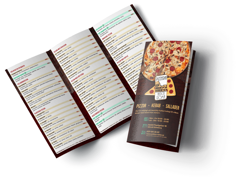 Antica Roma erbjuder pizzor med smak av Italien och alla pizzor innehåller egen tomatsås & ost. Vår smakfulla italienska pizzor finns även med glutenfri pizzabotten.